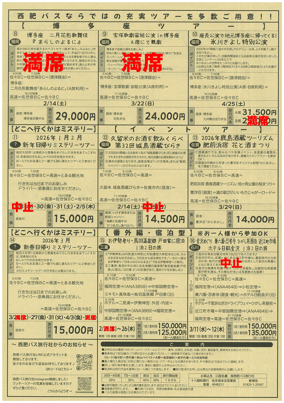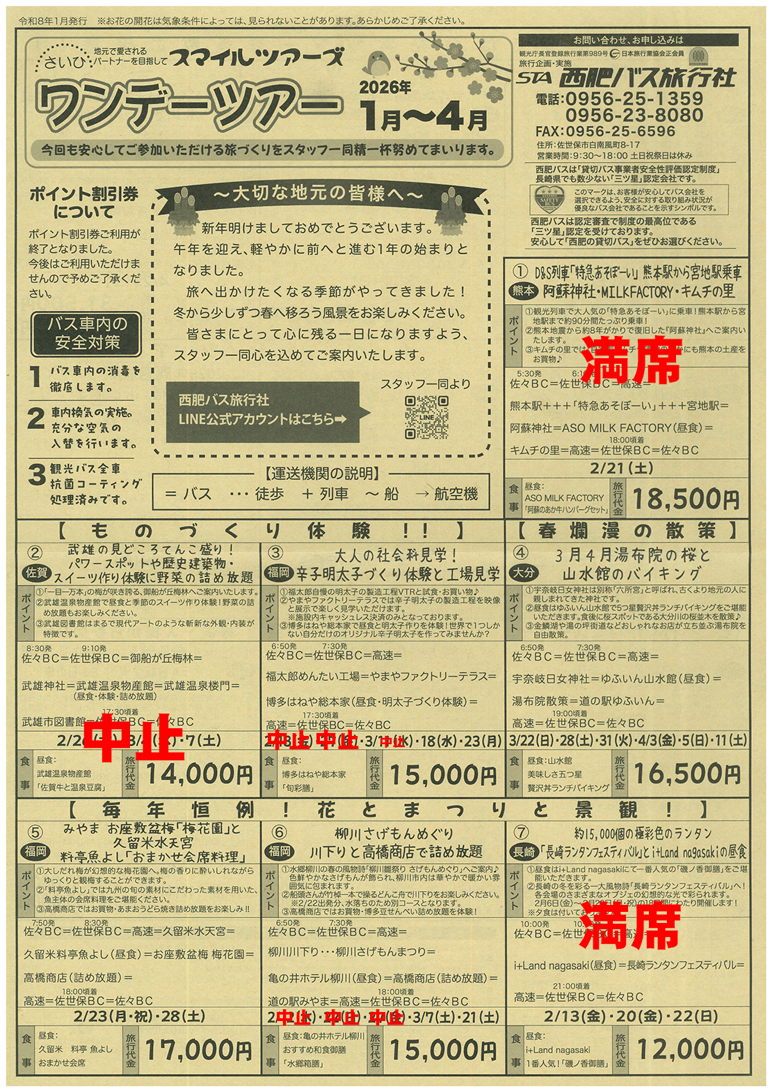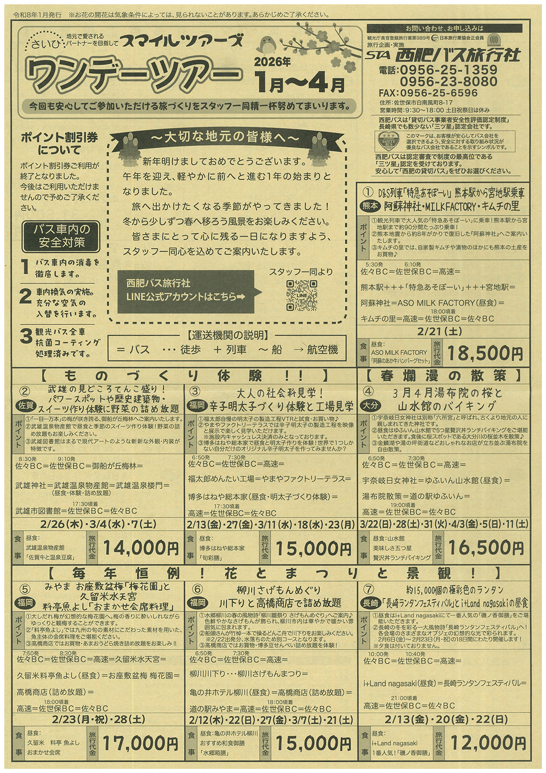 ワンデーツアー1~4月号 2022.06.082026.01.14 2026年 1~4月号 【お客様へ 訂正箇所のおしらせ】 ワンデーツアーチラシに掲載中の⑯【石川】金沢めぐり 兼六園・忍者寺 ひがし茶屋街 近江町市場 ホテル日航金沢 1泊2日の旅 2日目に記載しております行程におきまして以下の通り訂正いたします。 (誤)中部国際空港 ⇒ (正)小松空港 大変申し訳ございません。 上の画像をクリックするとチラシが拡大されます。 今月のおすすめコース! ①【熊本】D&S列車「特急あそぼーい」熊本駅から宮地駅乗車 阿蘇神社・MILKFACTORY・キムチの里約90分間たっぷり乗車!①【熊本】D&S列車「特急あそぼーい」熊本駅から宮地駅乗車阿蘇神社・MILKFACTORY・キムチの里佐々BC5 :30発=佐世保BC6 :10発=高速=熊本駅+++「特急あそぼーい」+++宮地駅=阿蘇神社=ASO ... ③【福岡】大人の社会科見学!辛子明太子づくり体験と工場見学大人の社会科見学!③【福岡】辛子明太子づくり体験と工場見学佐々BC6:50発=佐世保BC7:30発=高速=福太郎めんたい工場=やまやファクトリーテラス=博多はねや総本家(昼食・明太子づくり体験)=高速=佐世保BC17:30頃着=佐々BC出発...