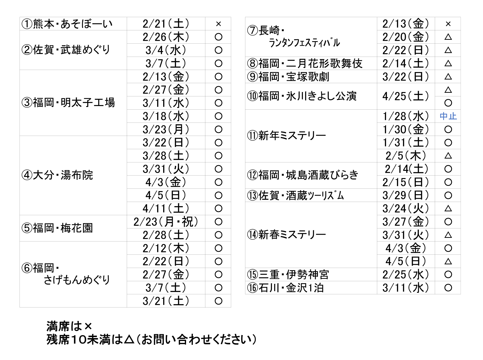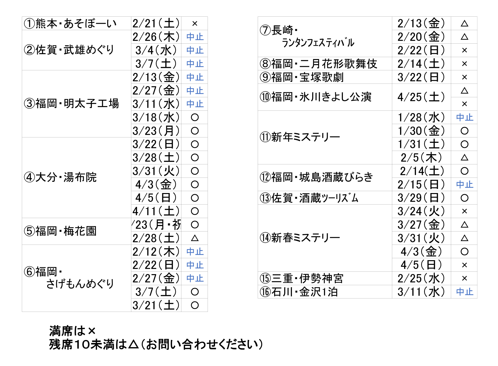 ワンデーツアー 予約状況